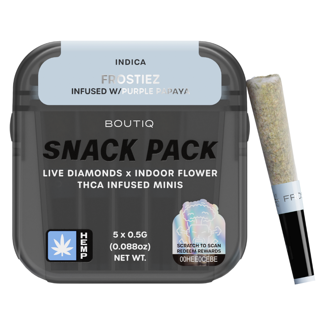 Elevate your session with Boutiq Snack Pack Live Diamonds Minis, a curated pack of five half-gram pre-rolls infused with a potent pairing of THC-A flower and live diamonds. Each mini is thoughtfully crafted with two strain combinations—one for the flower and another for the diamonds—delivering a layered and complex experience for seasoned users.