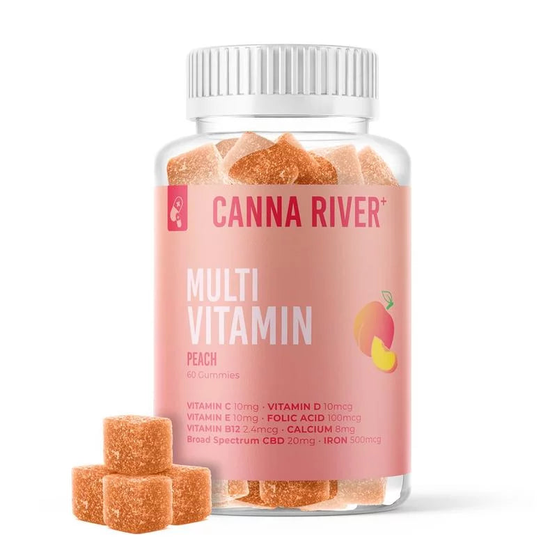 Elevate your daily vitamin intake with Canna River Multi Vitamin Broad Spectrum Gummies, a premium and delicious way to support your overall well-being. Crafted with the utmost care and high-quality ingredients, these CBD-infused gummies offer a delightful peach flavor that will leave your taste buds yearning for more. Each gummy is packed with essential vitamins, including vitamin C, D, E, B12, Folic Acid, Calcium, and Iron, making them a comprehensive addition to your daily routine. With a commitment to quality, these gummies are third-party lab tested for potency and purity, assuring you of their effectiveness. Made in the USA and infused with Broad Spectrum CBD, Canna River Multi Vitamin Broad Spectrum Gummies are a convenient and tasty way to enhance your daily vitamin intake while savoring every bite.