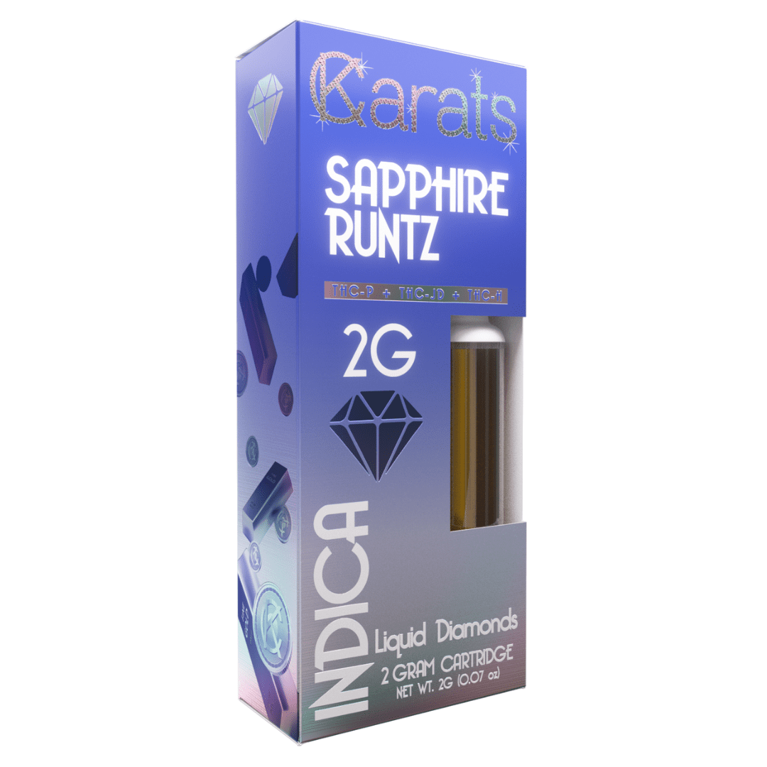 The Carats Liquid Diamond Cartridge is available in 5 different strains such as Sapphire Runtz and Audemar OG. Hybrid, indica, and sativa options are offered to suit your desired effect.