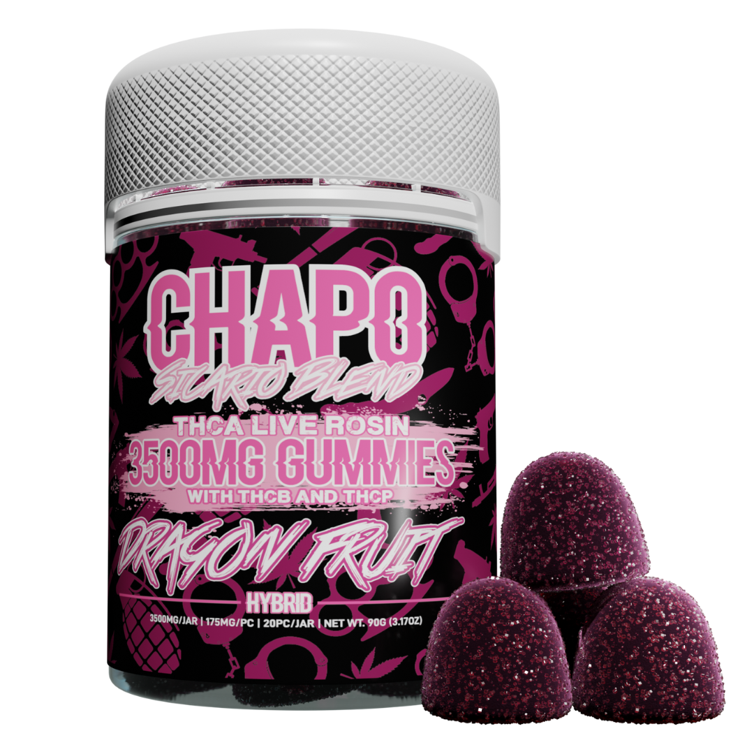 Hey, sweet tooth! Ready for a treat that packs more than just flavor? Introducing Chapo Sicario Blend Gummies – the ultimate combo of taste and buzz. Each jar is a flavor explosion, packed with 20 gummies, and here's the kicker: every single bite has a whopping 175mg, adding up to a total of 3500mg per jar. With a mix of delta 8 THC, THC-B, THC-P, and live rosin THC-A, these aren't just your average gummies.