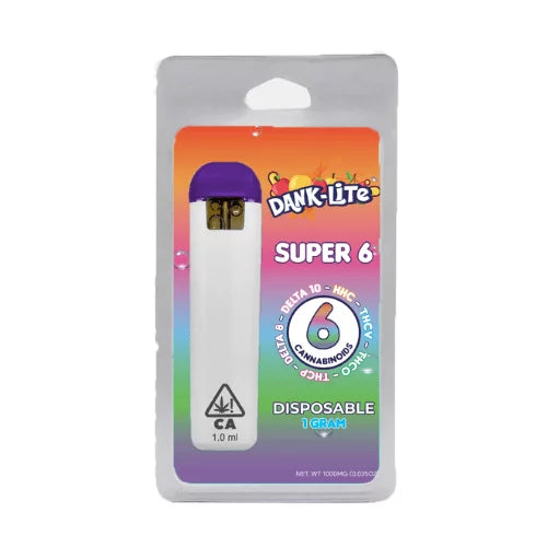 Searching for disposable that is super dank and also flavorful? Your search ends here. This 1 gram Dank Lite Super 6 Disposable is infused with 6 powerful cannabinoids: delta-8, delta-10, HHC, THC-O, THC-V, THC-P. They also incorporate botanical naturally-derived terpenes, packing a punch of flavor with each hit. These Dank Lite Disposables are available in 1 strain.