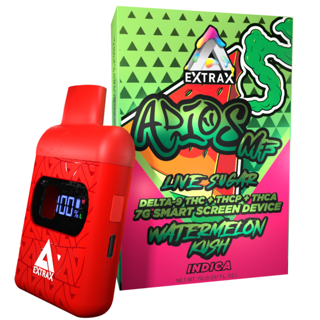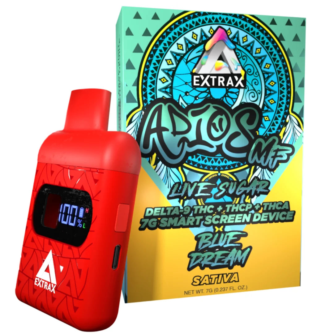 Check out the Delta Extrax Adios MF Disposable, the upgraded version of their previous, popular 4.5-gram Adios disposable. This next evolution of the Adios Blend features a powerful combination of delta-9 THC, THCP, THCa Live Sugar, and delta-8 THC, offering an unparalleled vaping experience. With a generous 7 grams of premium distillate in each disposable, you'll enjoy long-lasting relief and relaxation on the go.
