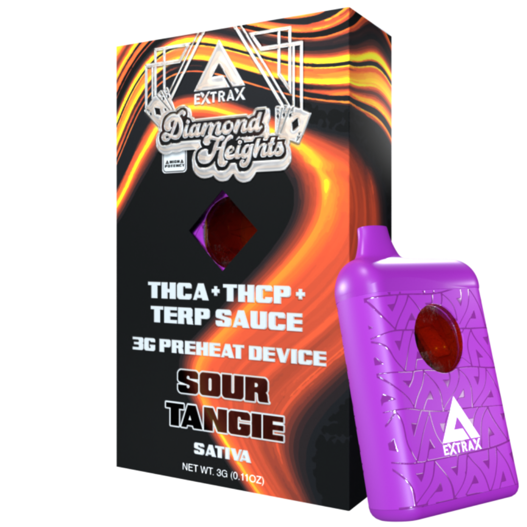 Introducing the Delta Extrax Diamond Heights Disposable, the pinnacle of convenience and potency in the world of hemp vaping. Crafted with precision, each disposable is infused with 3 grams of premium THCA, THCP, and terp sauce, ensuring a robust and flavorful experience with every draw. Featuring a preheat function and rechargeable design, these disposables offer unparalleled convenience, allowing you to enjoy your favorite strains anytime, anywhere. With a sleek and ergonomic design and a large distillate-view window, the Diamond Heights Disposable combines style with functionality, making it a must-have for hemp enthusiasts on the go.