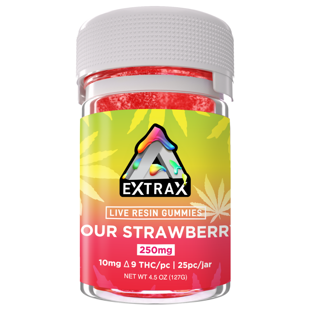 Treat your taste buds and elevate your mood with Delta Extrax Live Resin Delta 9 Gummies—crafted for those who crave a flavorful, legal, and balanced THC experience. Each gummy is infused with 10mg of hemp-derived Delta 9 THC, offering a smooth, enjoyable high that’s perfect for day or night. With 25 gummies per jar, you'll enjoy 250mg total of potent Delta 9 THC, derived from premium live resin extract for an enhanced full-spectrum effect.