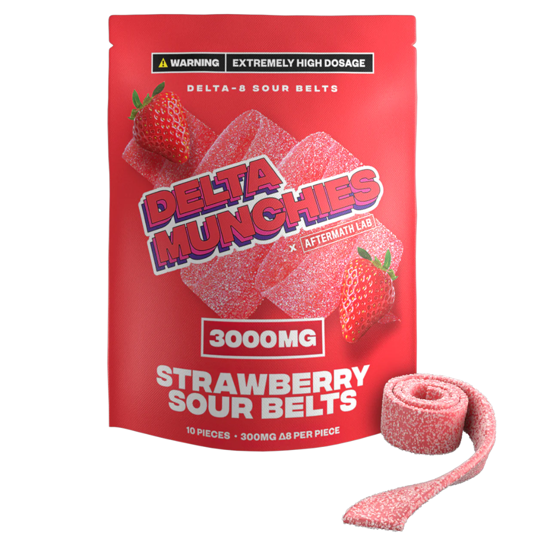 Delta Munchies introduces the most potent gummies in their lineup - the Delta 8 Sour Belts. These belts set a new standard in the market, not just within our range but across the industry, being the strongest Delta 8 gummies available anywhere. Each bag bursts with flavors of Berry Blue, Green Apple, and Strawberry, containing a total of 3000mg of D8, breaking down to an impressive 300mg of delta-8 THC per belt.