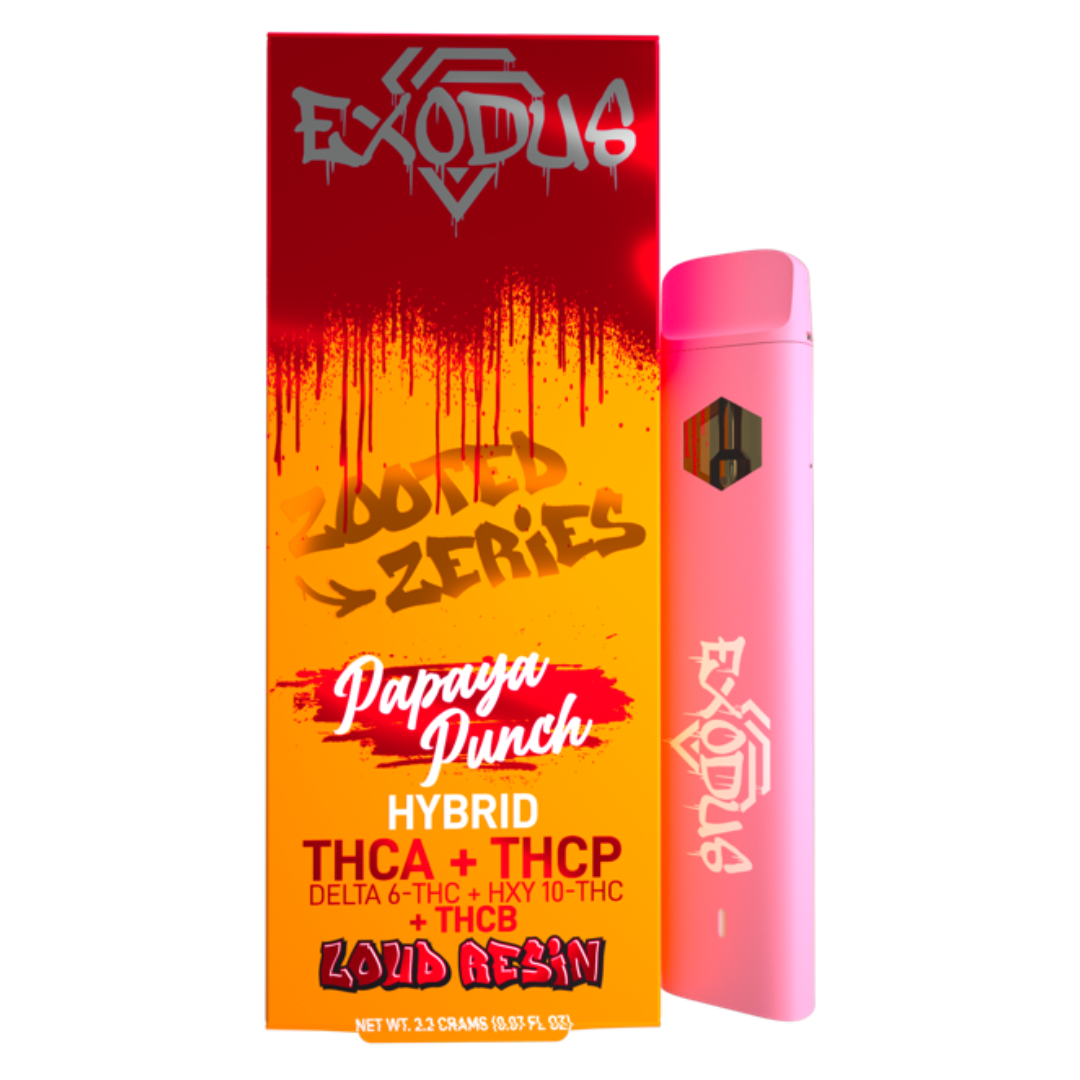 Get ready to experience next-level potency with the Exodus Zooted Zeries THC-A Disposable—a 2.2-gram device engineered to deliver a full-spectrum cannabinoid experience like no other. This isn’t your average disposable—Zooted lives up to its name, featuring an ultra-potent blend of Delta 6 THC, THCA, THCP, HXY-10 THC, THCB, and Loud Resin for maximum elevation, smoothness, and intensity.