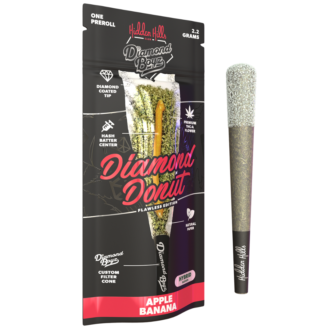 The Hidden Hills Club x Diamond Boyz Diamond Donut is a premium infused pre-roll crafted for smokers who demand absolute top-tier quality. This 2.2-gram pre-roll is packed with top-grade THC-A flower, featuring a potent hash batter center and a diamond-coated tip for elevated potency and flavor.