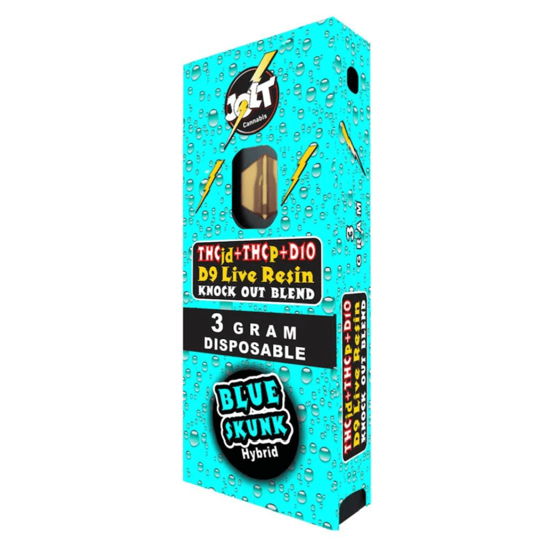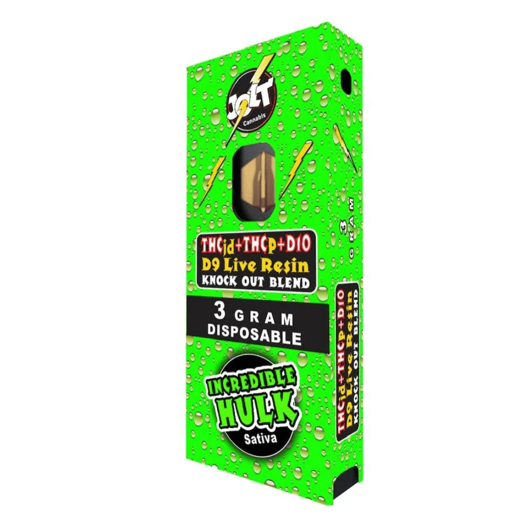 Jolt KO Blend Disposables are available in 5 different flavors such as Blue Skunk and Incredible Hulk. Indica, sativa, and hybrid options are offered to suit your desired effect.