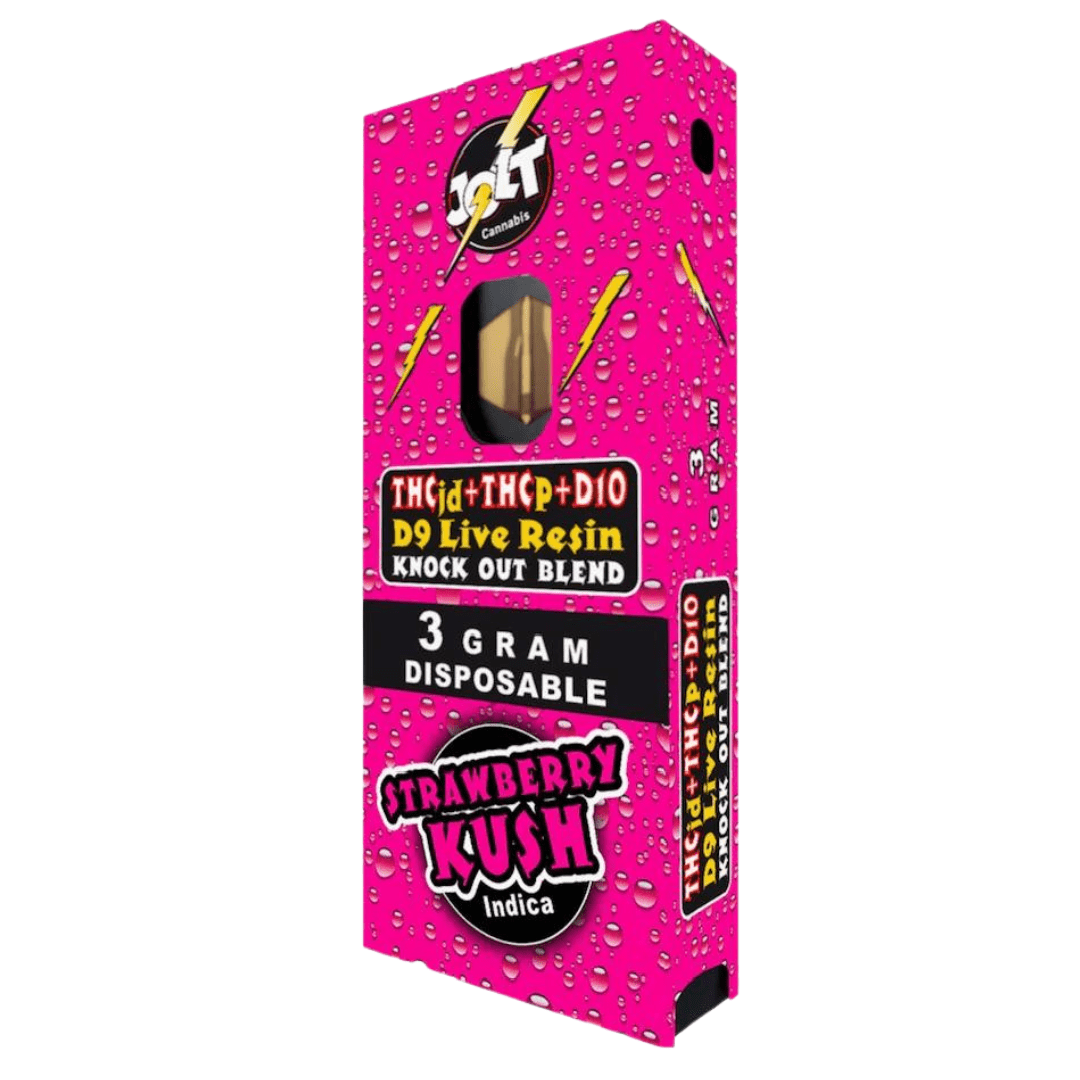 Introducing the all-new Jolt Knockout Blend Disposable! This disposable vape pen is exceptionally potent, containing three potent cannabinoids derived from live resin. Live resin extraction involves freezing hemp plants to extract cannabinoids, resulting in more natural terpenes and authentic flavors than other extraction methods. Jolt KO Blend Disposables are infused with an exclusive blend of delta 9 THC, THC-P, and delta 10 THC. Additionally, Jolt's 3-gram disposable vape pens feature a compact rectangular design with a large window displaying the remaining distillate for your convenience. They are also rechargeable via Micro-USB.