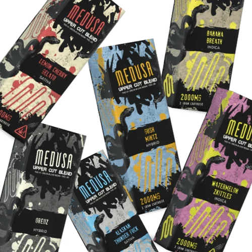 Medusa Uppercut Blend Cartridges are currently available in 7 different flavor profiles. The strains offered are quite new to the market, such as Lemon Cherry Gelato and Gush Mintz. Indica, Sativa, and Hybrid selections are provided so that you?re able to get the exact experience you desire.