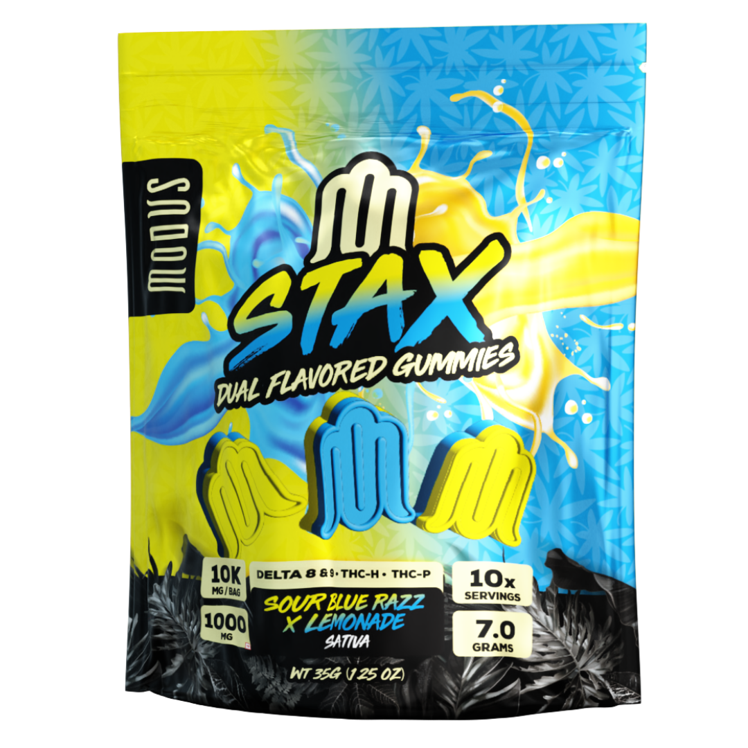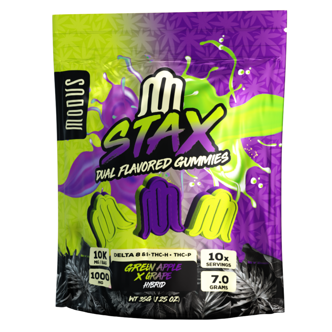 Step into a new realm of edible excellence with Modus Stax Dual Flavored Gummies, a powerful blend of bold flavors and high potency. Each bag delivers a whopping 10,000mg total—packed into 10 dual-flavored gummies, with 1,000mg of cannabinoids each. This ultra-potent formula features a balanced infusion of Delta 8 THC, Delta 9 THC, THC-H, and THC-P, offering a dynamic entourage effect that elevates both body and mind.