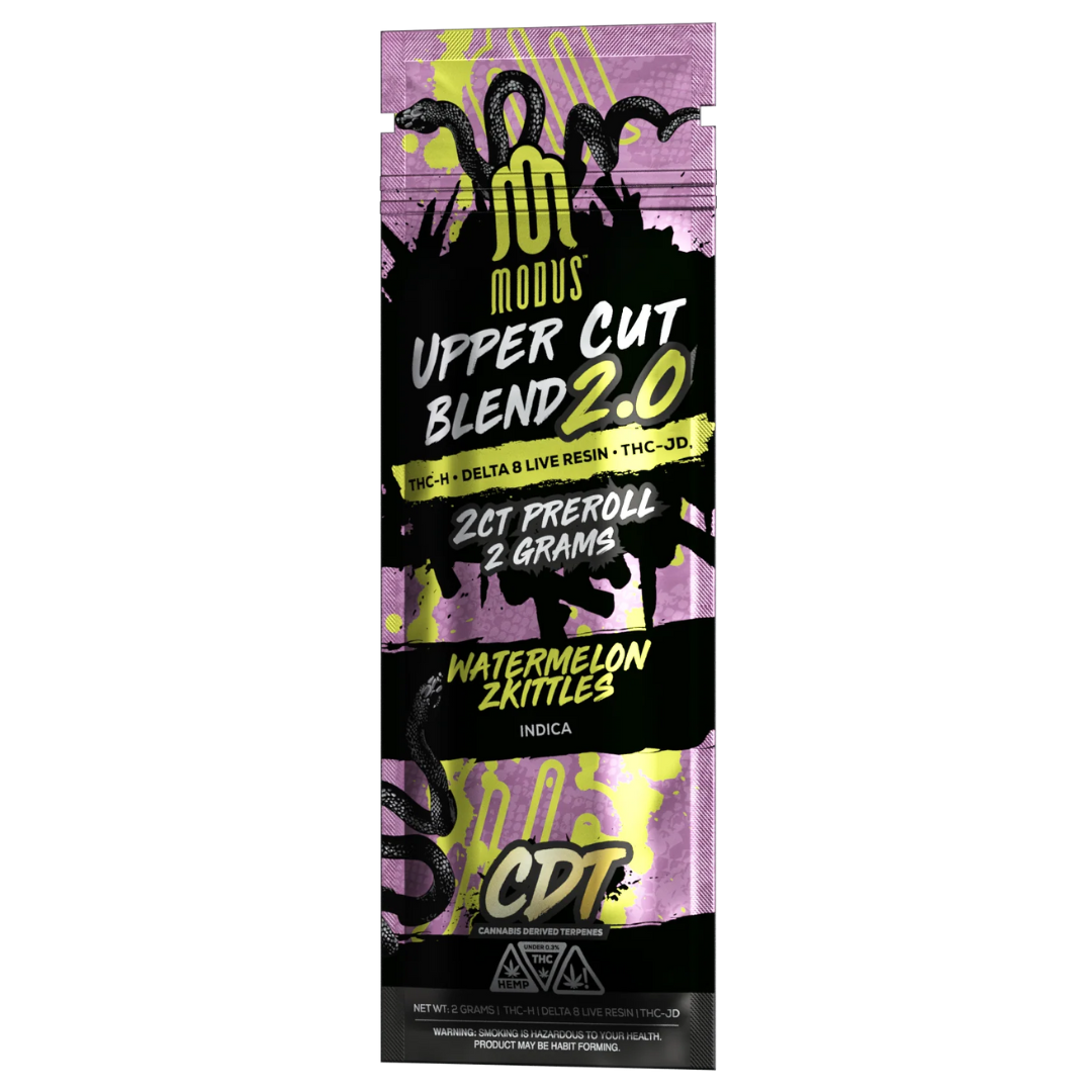 Introducing the second generation of Modus Upper Cut Blend Pre-Rolls, a superior choice for those seeking an enhanced smoking experience with a potent kick. Each pack comes with two tightly rolled pre-rolls, each containing 2 grams of top-tier fresh flower combined with live resin, crafted to deliver a memorable and intense session. These pre-rolls feature a unique selection of premium cannabinoid extracts including THC-H, live resin delta 8 THC, and THCjd, which together amplify the effects and provide a fuller, richer experience. Sourced from high-quality, legally grown U.S. hemp, these extracts ensure each pre-roll meets the highest standards of potency and purity.