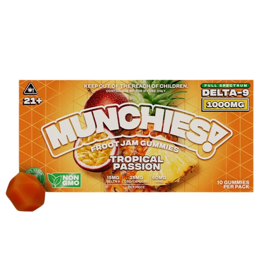 Get ready to blast off with Munchies Froot Jam Gummies—the ultimate full-spectrum, fruit-fueled edible for hemp enthusiasts who crave bold flavor and serious potency. Each pack contains 10 gushers-style gummies, bursting with real fruit purée and packed with 100mg of cannabinoids per piece—including Delta 9 THC, HHC, CBD, CBG, and CBN.