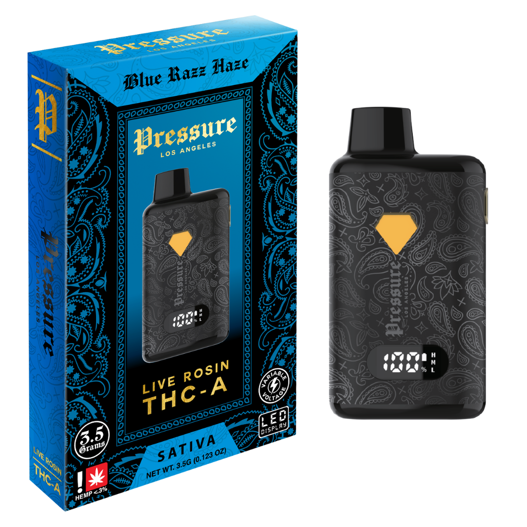 Unleash the purity and power of solventless extraction with the Pressure LA THC-A Live Rosin Disposable, a 3.5-gram button-activated vape designed for users who demand quality, flavor, and performance in every puff. This device is infused with THCA live rosin, a full-spectrum extract known for preserving natural cannabinoids and terpenes, resulting in a smoother, more flavorful experience.