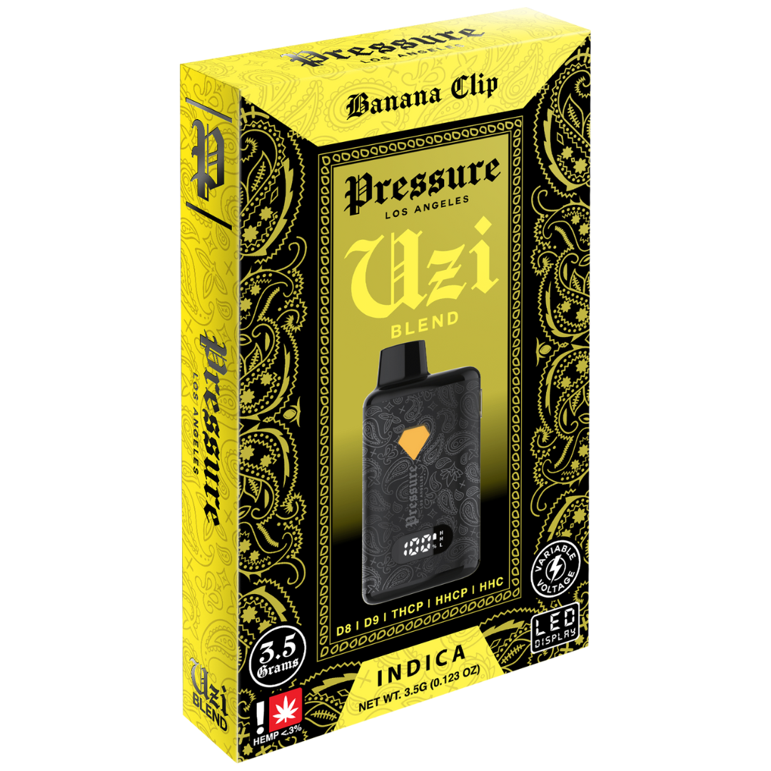 Introducing the Pressure UZI Blend Disposable, a cutting-edge 3.5 gram device infused with the exclusive UZI Blend. This potent blend includes D8, D9, THCP, HHCP, and HHC, crafted to deliver an entourage effect for a superior vaping experience. The device showcases an innovative design with user-friendly features, including a preheat function, button activation, and variable voltage settings for customized usage. Enhanced with a USB-C charging port for convenient recharging and a digital battery display to keep track of power levels, this disposable device ensures reliability and ease of use. Available in 10 unique strains with indica, sativa, and hybrid options, each disposable is filled with naturally-derived terpenes to provide authentic flavors and aromas.