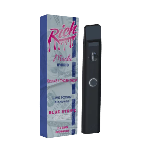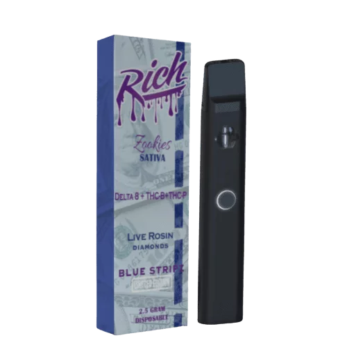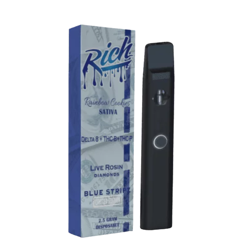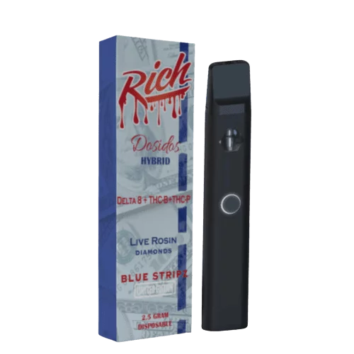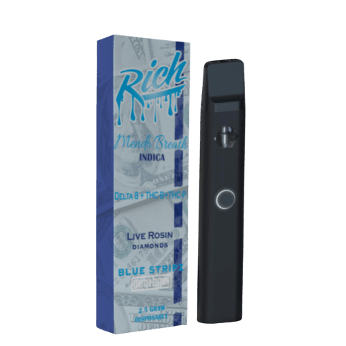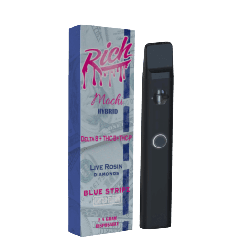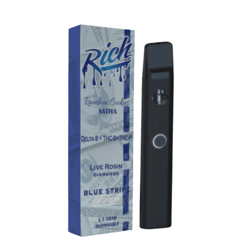 Rich is a new brand that's ready to take over the hemp industry. Introducing the all-new collection of Rich Blue Stripz Disposables. These disposables consist of 2.5 grams of a proprietary blend of live resin diamond extract of 3 powerful cannabinoids: delta-8, THC-B, and THC-P, which is known to induce a very potent blast of relaxation. These disposables are crafted using the latest innovative technology, featuring a pre-heat button and negating inconvenient defects such as clogging, leaking, and faulty batteries. Rich products always undergo third-party lab testing to assure of potency, accuracy, and safety.