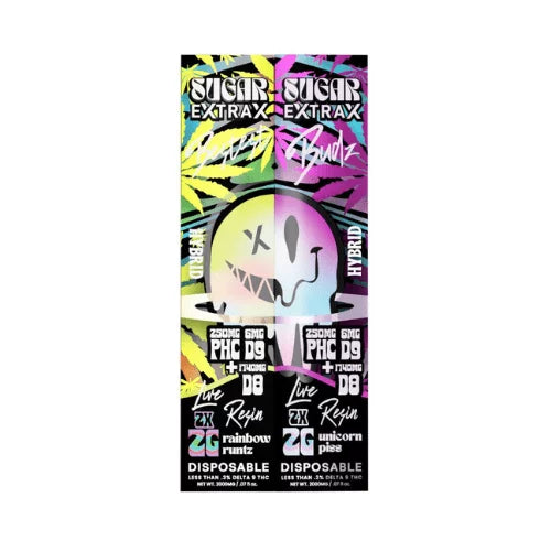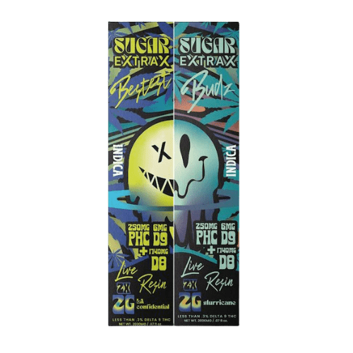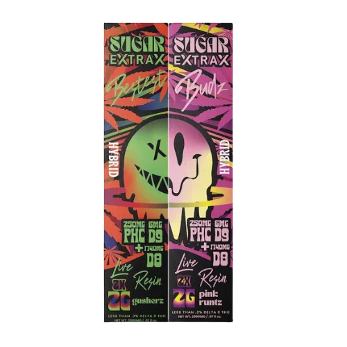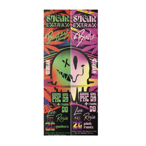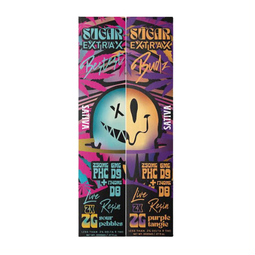 Sugar and Delta Extrax have collaborated again for a brand new set of flavors for their Best Budz collection. Introducing the Sugar Extrax Bestest Budz Disposable! These disposables are infused 4 grams featuring 3 powerful cannabinoids: delta-8 THC, delta-9 THC, and PHC (250mg PHC, 6mg D9, 1740mg D8). They use a live resin extract procedure for the distillate, which preserves a higher amount of terpenes, trichomes, and cannabinoids. This results in not only a more potent experience, but also a more flavorful one. Each package brings 2 separate disposables with 2 grams of distillate from 2 different strains for a total of 4 grams.
