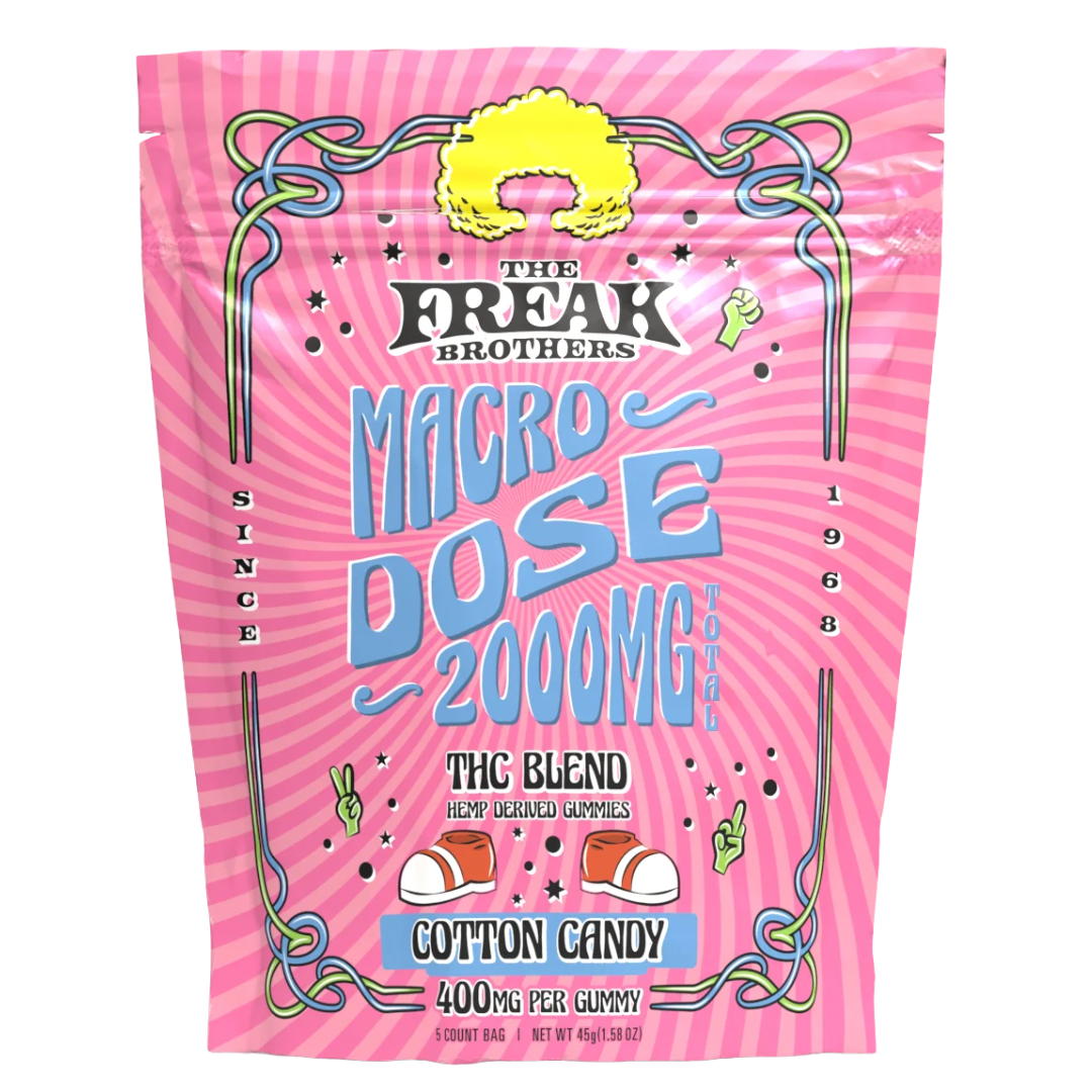 The Freak Brothers Macro Dose Gummies bring serious potency and flavor in every bite. Each bag contains 5 gummies packed with 400mg each, totaling a massive 2000mg per bag. Infused with a balanced blend of CBD, Delta 9 THC, Delta 8 THC, THC-A, and THC-P, these gummies deliver a full-spectrum experience that’s as powerful as it is enjoyable. Perfect for hemp users seeking elevated effects and long-lasting relief, The Freak Brothers gummies are third-party lab tested to ensure purity, consistency, and compliance.