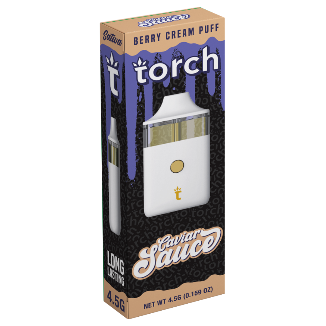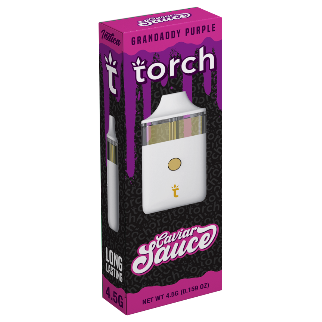 The Torch Caviar Sauce Disposable is available in 10 unique and classic strains such as Berry Cream Pie and Grandaddy Purple. Hybrid, indica, and sativa flavors are offered to suit your desired effect. Rest assured, all batches are sent for third-party lab testing to verify its potency, accuracy, and safety.